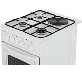 Горелки стола: Газовые – 4 шт. Мощность горелок рабочего стола: Горелка передняя левая/правая – 2,0/2,4 кВт. Горелка задняя левая/правая – 2,0/1,0 кВт. Электрический духовой шкаф. Объем духовки в литрах: 65 л. Верхний/нижний нагреватель духовки – тен.Решетка рабочего стола – сталь. Крышка рабочего стола – стекло. Термометр духовки. Кнопка электророзжига горелок стола. Электрическая подсветка духовки. Противень – 2 шт. Цвет Белый.