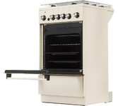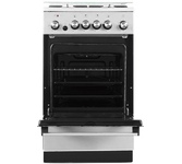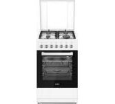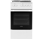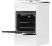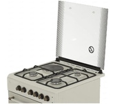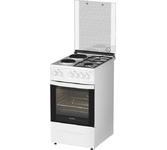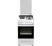 Цвет - белый. Размеры, мм - высота/ширина/глубина – 850/500/500. Вес, кг - 38. Электророзжиг. 4 газовые конфорки 1,0/1,75/1,75/3,0 кВт. Газ контроль. Духовка: Два нагревательных элемента: 1,2 кВт и 0,8 кВт. Электрическая духовка. ТЭН-гриль - 1,8 кВт. Терморегулятор. Освещение. Вертел. Гриль. Механический таймер. Объём духовки 46 л. Комплектация: Большой противень. Малый противень. Решётка для жарки. Чугунная решётка. Стеклянная крышка рабочего стола. Хозяйственный отсек.