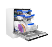 Посудомоечная машина MAUNFELD MLP-12SR представлена в белом цвете. Она обладает шириной корпуса 60 см и вмещает в себя до 14 комплектов посуды. В нее встроены 4 программы и 4 температурных режима: интенсивная, экономичная, быстрая, 90 минут. Загружать посуду можно на 2 уровня. Устройство снабжено конденсационным типом сушки, потребляющим намного меньше энергии в сравнении с другими типами. После мытья и полоскания посуда подвергается обработке горячей водой, и образует пар. Он поднимается, после чего оседает на холодных стенках шкафа. Затем конденсат стекает в специальный резервуар на дне, откуда он удаляется насосом. Управление посудомоечной машиной Маунфелд MLP-12SR осуществляется с помощью электронной панели, которые максимально упрощают эксплуатацию прибора. Также вы можете установить отсрочку старта от 1 до 24 часов. При малом количестве кухонной утвари поможет функция половинной загрузки, которая поможет сэкономить время, воду и электричество. По подсчетам производителя, в таком случае воды