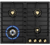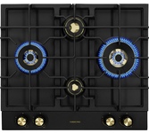 Латунные энергоэффективные конфорки; электроподжиг; ГАЗ-контроль, решетка: чугунная; WOK конфорка; цвет поверхности: матовый черный; цвет ручек: черный+бронза; Ширина (см) 58,4; Глубина (см) 51;
