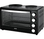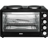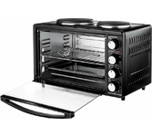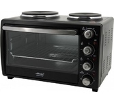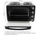 30 л,, механическое упр., 1500 Вт, две конфорки 1000Вт/600Вт, таймер 120 минут со звуковым сигналом, регулировка температуры 100-250 С, функции: гриль, жарка, запекание, Регулировка мощности конфорок, эмалированный противень, решетка и ручка для противня в комплекте