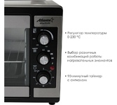 Объём 46 литров. Выбор различных комбинаций работы нагревательных элементов. Регулятор температуры 0-230 °C. Защита от перегрева. Световой индикатор работы. 60-минутный таймер с сигналом . Номинальная мощность 1500-1650 Вт. 220-240 B ~ 50 Гц.