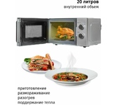 Объем 20 л; Мощность 700 Вт; 6 уровней мощности; Максимальное время приготовления 30 мин; Поворотный стол 24,5 см; Функция разморозки; Сигнал об окончании готовки; Механизм открывания дверцы – кнопка; Тип управления: механический; Цвет: белый с черными ручками и хромироаными вставками