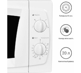 Объем 20 л; Мощность 700 Вт; 5 уровней мощности; Максимальное время приготовления 35 мин; Поворотный стол 25,5 см; Функция разморозки; Сигнал об окончании готовки; Механизм открывания дверцы – ручка; Тип управления: механический; Цвет: белый, размер печи нетто 440x346x259 мм