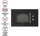 Общие данные: Габариты: 38,8х59,5х34,35 см Объем: 20 л Тип управления: механический Режимы работы: соло + гриль Мощность микроволн: 800 Вт Мощность гриля: 1000 Вт Цвет: черный Вес: 15 кг Управление и функции: Механическое управление Звуковой сигнал Дополнительная информация: Потребляемая мощность: 1250 Вт Подсветка камеры Дверца навесная Открывание дверцы-кнопка Диаметр крутящегося поддона, мм: 245 Комплектация: вращающееся кольцо, стеклянный поддон, решётка для гриля, инструкция на русском языке, комплект для установки (трафарет, зажим, болты, ориентир)