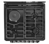 Размеры (ШхГхВ) 50x54х85см, объем духовки 50 л, 4 конфорки, стеклянная крышка, хоз. отсек, комбинированная (верх-3-газ/1-электро), электрическая духовка, профильная решетка, подсветка духового шкафа, электророзжиг стола, еврошарнир