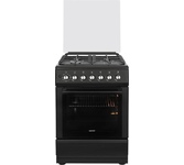 ШхГхВ: 60х60х88 см; 4 газовые конфорки; автоподжиг; решетка: чугунная; газовая духовка: 64 л; подсветка; гриль; отделение для хранения посуды; таймер механический; крышка: стекло; цвет: черный матовый