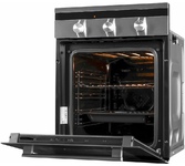 Электрический духовой шкаф; 12 режимов; LED дисплей; поворотные переключатели; металлические направляющие; объем - 72л; 2 стекла дверцы; 1 решетка; 1 противень; 1 глубокий противень; Цвет: Черный/Ручка Dark Inox