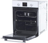 Общие данные: Габариты: 60х59.6х60 см Габариты ниши для встраивания: 56.4х56.4х56-57 см Объем: 64 л Гриль: есть Конвекция: есть Таймер: есть Подсветка: есть Самоочистка: эмаль Количество режимов работы: 6 Управление: Поворотные переключатели Переключатель режимов: 7-позиционный Механический таймер Безопасность: Система охлаждения духовки Комплектация: Большой противень Малый противень Решётка для жарки Шнур, вилка Дополнительная информация: Съемные направляющие для противней Фасад: белое стекло Номинальная потребляемая мощность: 2275 Вт Верхний ТЭН: 1,1 кВт 1 Нижний ТЭН: 1,1 кВт ТЭН - гриль: 2,0 кВт Вес: 33 кг
