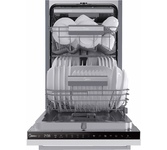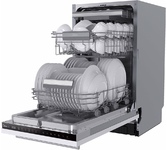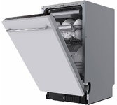 Узкая встраиваемая посудомоечная машина. Мощность: 2100 Вт. Класс энергопотребления: A+++. До 10 комплектов посуды. Корзина для столовых приборов. Регулировка корзин по высоте. Полка для чашек. 3 разбрызгивателя. Сенсорное управление. LED дисплей. Индикация: нехватки соли, ополаскивателя, уровня потребления воды и электроэнергии. Отложенный запуск до 24 часов. Освещение камеры. Регулировка жёсткости воды. 8 Программ. Инверторный мотор (BLDC). Сушка: дополнительная/интенсивная. Возможностью отмены автооткрывания двери. Защита от протечек. Расход воды: 8 л/цикл. Съемный трехкомпонентный фильтр. Габариты (ШхГхВ): 448*550*815 мм. Длина шнура питания: 1500 мм (с вилкой).