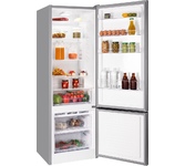 Двухдверный холодильник серии COMBI, морозильная камера снизу. No Frost, полезный объем 237 (182+55) литров, А+ класс, 42 дБ, R600а, N-ST, LED подсветка, потребление энергии 256 кВт/год, мощность замораживания 2,5 кг/сутки. Холодильное отделение: 3 полки из стекла, 3 боковых полки, 1 большой ящик для овощей и фруктов. Морозильное отделение: 2 выдвижных ящика, 1 лоток с легким доступом. Вес нетто и брутто 51 и 55 кг, цвет нержавеющая сталь. Регулируемые ножки, перенавешиваемые двери, интегрированные ручки.