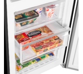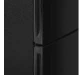 Холодильник Maunfeld MFF200NFBE выполнен в черном цвете и имеет габариты 59,5×200×60 см. Модель отлично впишется в интерьер вашей кухни. Современный компрессор экономит электроэнергию, тихо работает — шум составляет 42дБ. Устройство может быть установлено на кухне вплотную к мебели и стенам без зазоров, благодаря конденсаторной решетке закрытого типа. Ко встроенным настройкам устройства относится функция «Отпуск», которая удобна, если требуется надолго отлучиться из дома или квартиры. Во время ее действия холодильное отделение останавливается, работает только морозильная камера. Хладагент R600A — абсолютно безвреден для окружающей среды, экономичен и не причиняет вреда озоновому слою. Функция Humidity control позволяет регулировать влажность в зоне свежести. Система NoFrost — конструктивное решение, при котором испаритель внесен в отдельный отсек, где и происходит охлаждение воздуха. Общий полезный объем техники составляет 351 л, из которых 257 л приходится на холодильную камеру, а 94 л