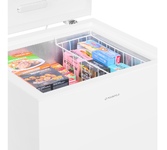 Морозильный ларь MAUNFELD MFL150W — это отдельностоящая морозильная камера. Дверной упор здесь расположен сверху, это обеспечивает удобную загрузку, также легко доставать те продукты, которые нужны, т. к. пользователю сразу видно большинство продуктов. Внутренняя подсветка состоит из светодиодного освещения — это современный и выгодный вариант. Светодиодные лампы служат практически на протяжении срока всего использования морозилки, несмотря на то, что они стоят дороже, это и низкое потребление электроэнергии полностью окупают переплату. Морозилка Маунфилд при небольших габаритах оснащена вместительной камерой. Размеры следующие: 84 сантиметра в высоту, 63.5 сантиметров в ширину и 55.6 сантиметров в высоту, объем при этом составляет 142 литра. Прибор выполнен в современном стиле модерн, используется нейтральный белый цвет, поэтому модель будет отлично смотреться в комнате с любым интерьером. Корпус изготовлен из стали. Это прочный и надежный материал, он не боится физических воздействий и низких темп
