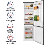 Общие данные: Размеры: высота (см): 192 ширина (см): 76 глубина (см): 73 Общий объем/ Полезный объем: Холодильника (л): -/450 Холодильной камеры (вкл. зону свежести) (л): -/300 Морозильной камеры (л): -/150 Тип управления: электронный Класс энергопотребления: A+ Климатический класс: SN-T (от +10°C до +43°C) Количество компрессоров: 1 Годовое потребление энергии: 418 кВтч Цвет: нержавеющая сталь Холодильное отделение: Полки из стекла Зона свежести Многопоточное охлаждение Multiflow system Система No Frost (Frost Free, Ноу Фрост) Светодиодное освещение на боковых стенках Быстрое охлаждение Ящики для фруктов и овощей Fresh Zone: 2 Подставка для яиц Морозильное отделение: Система No Frost (Frost Free, Ноу Фрост) Мощность замораживания: 6 кг/сутки Быстрая заморозка Форма для льда Дополнительная информация: Технология охлаждения: Triple Cooling Инверторный компрессор Сенсорный дисплей 7 Segment LED Active Fresh - электронные датчики для контроля температуры Режим «Отпуск» Сигнал оповещения об открытой двери Блокиро