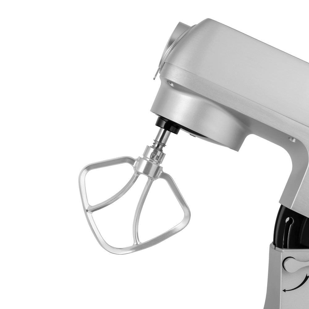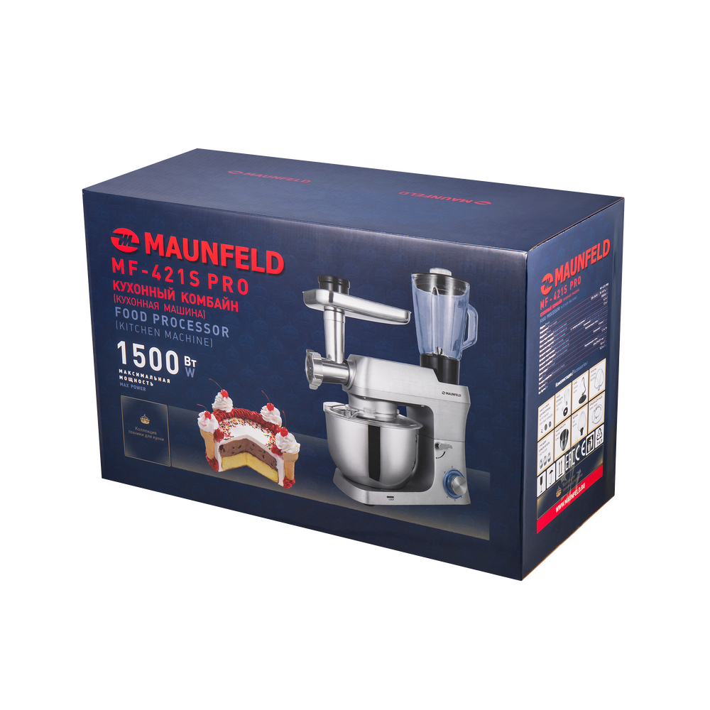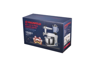 Кухонный комбайн MAUNFELD MF-421S PRO оснащен современным планетарным миксером, это значит, что содержимое в чаше перемешивается особенно тщательно. Такой эффект достигается с помощью специального вращения насадки по принципу движения планет. Объем чаши миксера составляет 6.2 литра, а блендера — 1.5 литра. Т. е. прибор достаточно вместительный, может смешивать или взбивать большое количество ингредиентов сразу. Корпус изготовлен из нержавеющей стали. Это прочный материал, он не боится физических повреждений, взаимодействий с низкими или высокими температурами, а также материал не подвергается коррозии. Механический тип управления устройством удобен и понятен при эксплуатации, он считается наиболее надежным, проверенным временем. Пользователю нужно взаимодействовать с поворотными переключателями. Чтобы разобраться во всех функциях комбайна, не придется постоянно пользоваться интернетом или инструкцией. Комплектация предусматривает наличие венчика, крюка для замешивания теста, лопатки для перемешив