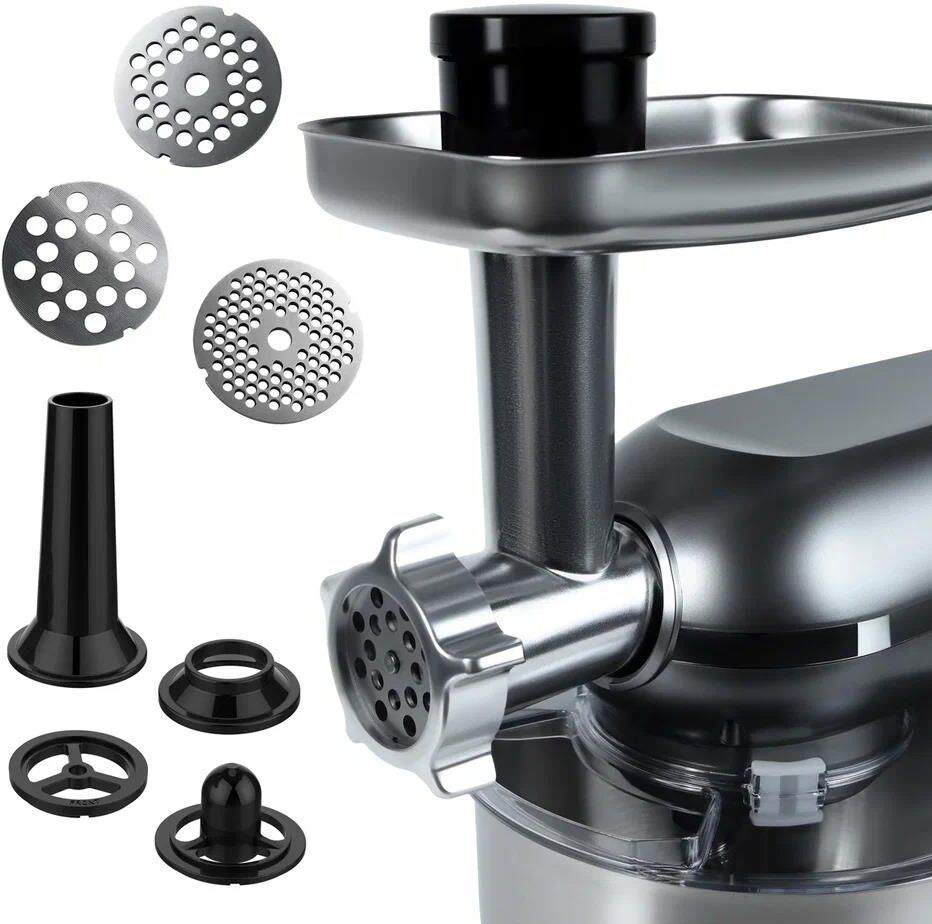 Многофункциональный кухонный комбайн мощностью 1500 Вт с 6 скоростями и импульсным режимом (от 70 до 220 об/мин) станет незаменимым помощником на кухне. Прибор работает от сети 220-240 В (50-60 Гц) и оснащен 4.5-литровой чашей из нержавеющей стали и 1.5-литровым стеклянным блендером, сочетая функции мясорубки, блендера, планетарного миксера и овощерезки (докупается отдельно). Прочный АБС-пластиковый корпус в железно-сером цвете дополнен LED-индикатором работы и удобным рычагом для подъема рабочей головки. Особенности включают плавную регулировку скорости, импульсный режим, ножки-присоски для устойчивости и простую смену насадок. В комплекте: металлическая чаша, защитная крышка, крюк для теста, плоский битер, венчик для взбивания, блендер, мясорубка (с насадками для колбасок и кеббе), руководство пользователя. Устройство упаковано в подарочную и транспортировочную коробки, а уровень шума менее 75 дБ делает работу комфортной.