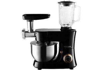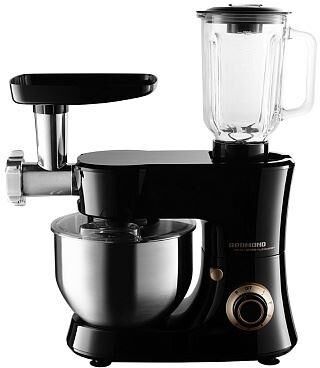 Кухонный комбайн. Цвет: черный. Максимальная мощность: 1200 Вт. Количество скоростей работы: 6. Импульсный режим. Съемный блок овощерезки. Съемный блендер с крышкой. Шинковка. Механическое управление. Номинальная мощность: 800 Вт. Съемный блок мясорубки. Материал корпуса: пластик. Защита от поражения электрическим током класс II. Защита от перегрева. Защита от перегрузки. Защита от включения при неправильной сборке. Плавный пуск двигателя. Миксер. Объем чаши миксера: 5 литров. Насадка для взбивания. Насадка для замешивания теста. Объем кувшина блендера: 1,5 литра. Материал кувшина блендера: стекло. Количество перфорированных дисков для приготовления фарша: 2. Насадка для приготовления колбасок/кеббе. Толкатель: 2 шт. Мелкая/Средняя/Крупная терка. Длина шнура электропитания 1 метр. Габаритные размеры: 307 × 380 × 220 мм. Вес нетто: 8 кг .Комплектация: основной блок, крышка чаши шнек мясорубки, блок мясорубки, насадка для приготовления колбасок, насадка-венчик, толкатель, овощерезки, насадка для замешивания тес