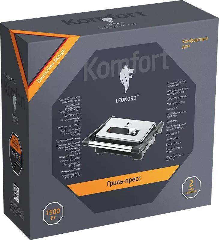 Мощность 1200Вт Световой индикатор работы и нагрева Сверхпрочное антипригарное покрытие TouchPro 5 Терморегулятор Ненагревающаяся ручка Прорезиненные ножки Корпус из металла и термостойкого пластика Поддон для сбора жира Фиксаторы закрывания крышки для удобства вертикального хранения Открывание на 180 градусов Размер пластин 26*16,5см Длина шнура 75 см Напряжение: 220-240 В, 50-60 Гц Гарантия 2 года