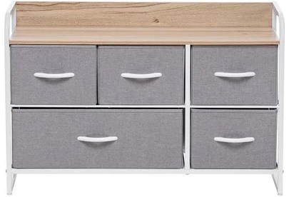 Комод представляет собой легкую конструкцию с металл каркасом на пластиковых ножках, с выдвижными ящиками из нетканого материала (лён). Над ящиками располагается полка из МДФ. Металлическая рама с нескользящими ножками долговечна, обеспечивает хорошую посадку и не вредит полу; Простой уход протирайте влажной тканью; Можно крепить к стене и регулировать по высоте; Быстрая сборка 10 минут. Рекомендуется прикручивать комод к стене с помощью шурупов (в комплекте), согласно инструкции. Это исключит возможность опрокидывания комода (особенно важно для детских комнат и помещений с маленькими детьми). Габариты ШхГхВ, 875х290х580. Полка (ШxГxВ), мм: 845х290х12. Задняя стенка: 845х80х15. Ящики (ШxГxВ), мм: 270х280х190, 4 шт. 540х280х190, 1 шт. Регулируемые по высоте ножки. Возможность крепить к стене. Водоотталкивающие материалы ящиков. Высота от пола до нижней перекладины полки - 70 мм.