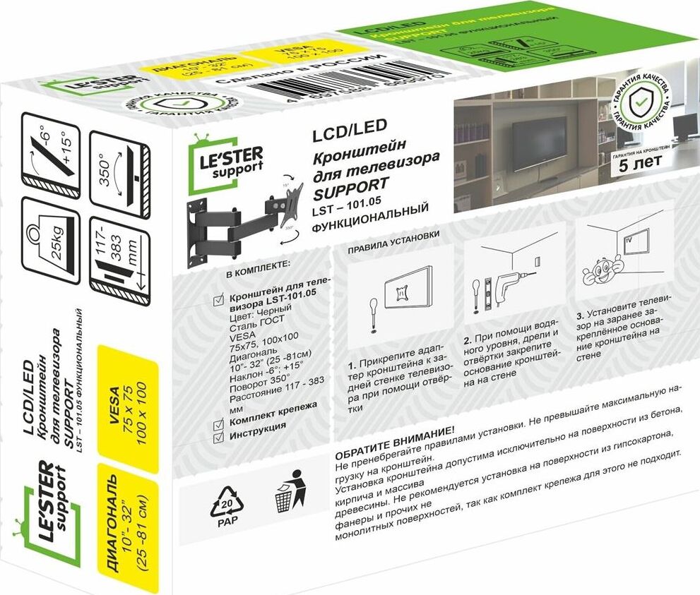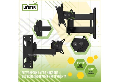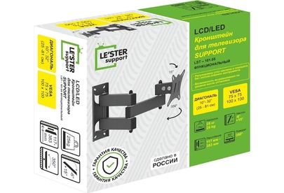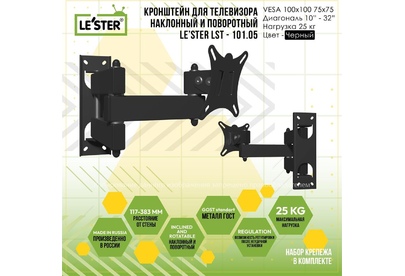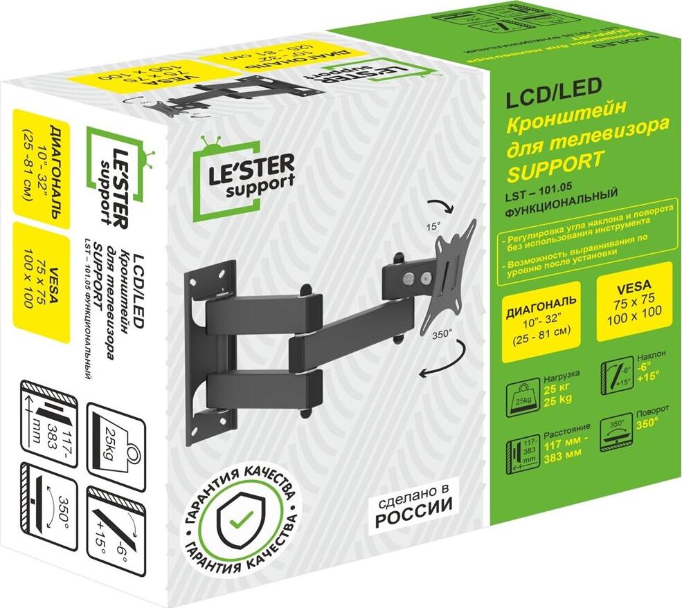 Наклонный-поворотный (Функц) Диагональ: 10"-32" (25-81см) Расстояние от стены: 117-383 мм Угол наклона: -6°/+15° Угол поворота: 350° Нагрузка: 25 кг Толщина металла адаптера 1,5 мм, основания 2 мм. Регулировка угла наклона и поворота без использования инструмента. Vesa 100*100.
