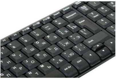 Набор беспроводной (клавиатура+мышь), интерфейс USB; клавиатура - классическая раскладка, мембранная, количество клавиш - 104, влагозащитная конструкция, тихий ход клавиш; мышь - оптическая, количество конопок - 3, разрешение - 1000 dpi, радиус действия - 10 м; комплект устойчив к механическим воздействиям.