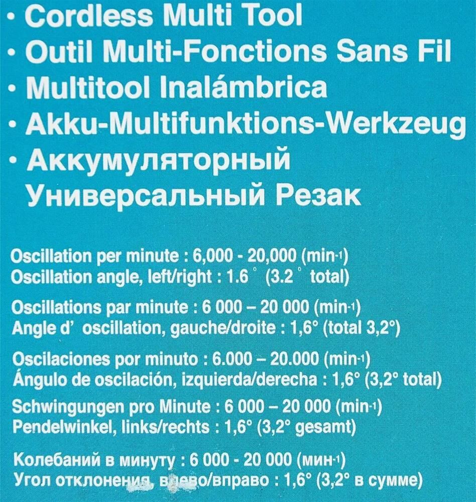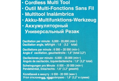 Мощность: 390. Регулировка частоты колебаний: есть. Угол колебания влево/вправо: 3.2. Сегментированный пильный диск в комплекте: нет. Пильное полотно в комплекте: нет. Дельташлифпластина в комплекте: нет. Рукоятка с мягкой накладкой: есть. Цвет: синий. Дополнительный цвет: черный. Тип электропитания: от аккумулятора. Количество аккумуляторов в комплекте: без аккумулятора. Зарядное устройство в комплекте: нет. Габариты упаковки (ед) ДхШхВ: 0.3x0.18x0.18. Вес упаковки (ед): 2. Вес товара: 2. Гарантия: 12 мес.. Число колебаний: 6000 - 20000ход/мин. Аккумулятор: Li-Ion, 18 В. Размеры товара (ДхШхВ): 340х80х. Функции: регулировка оборотов