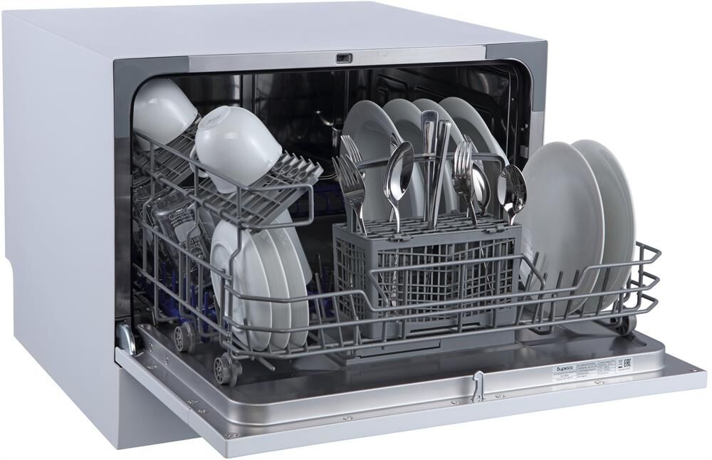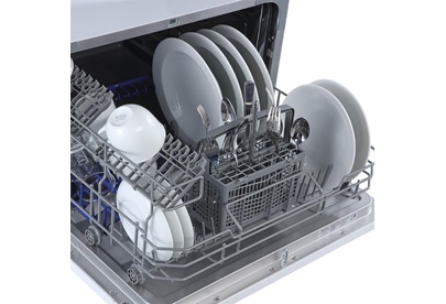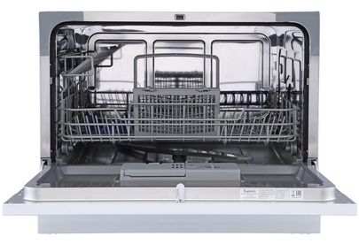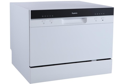 Компактная настольная посудомоечная машина расчитана на 6 комплектов. Отсрочка запуска 2/4/8ч. LED-индикация. Класс А+. 5 программ: интенсив, ECO, обычная, стекло, быстрая. Расход воды за цикл 6л. Энергопотребление за цикл 0,23 кВт*ч. Габариты ВхШхГ: 43,8x55x50 см.