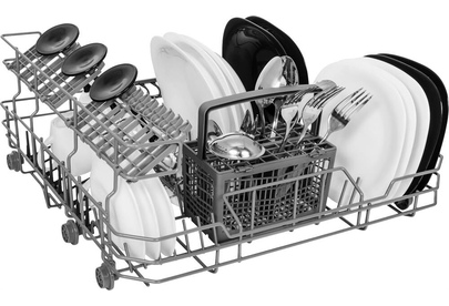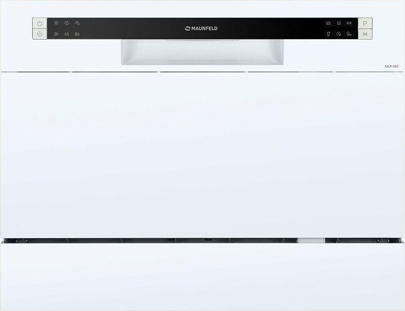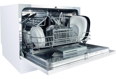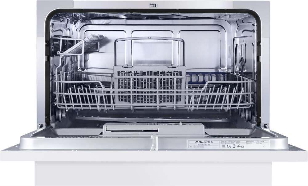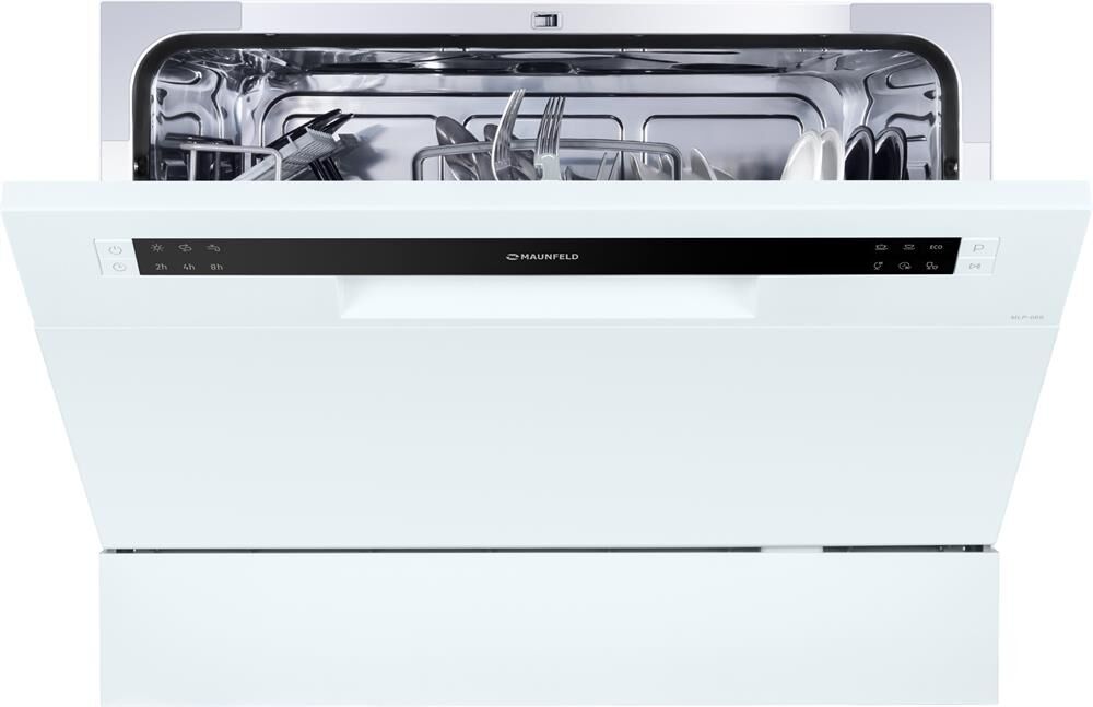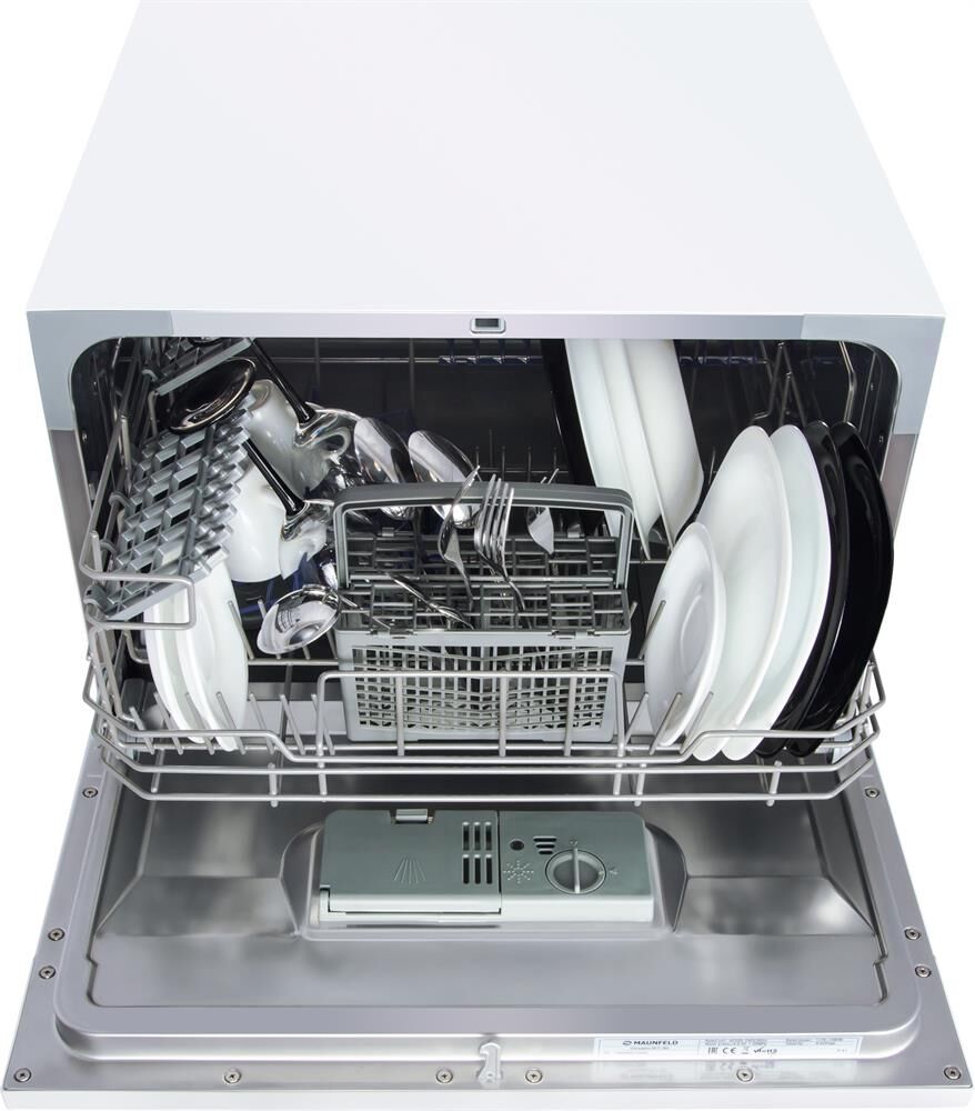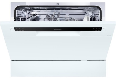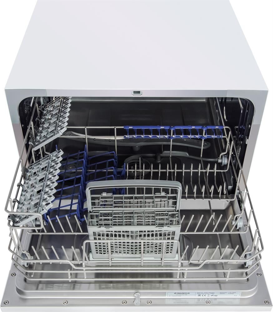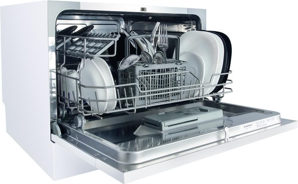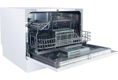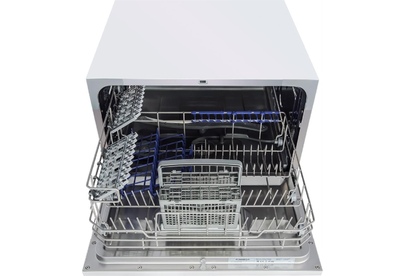 Компактная посудомоечная машина отдельностоящая. Количество комплектов 6. Сушка конденсационная. Габариты В/Ш/Г 43,8/55/50см. Цвет белый. Элементы управления кнопки. Дисплей LED. Количество программ 6. Количество температурных режимов 5. Отсрочка старта 2/4/6/8 часов. Количество корзин для посуды 1. Корзина для столовых приборов мобильная. Полка для чашек. Максимальный расход воды за цикл, 6,5л. Класс энергопотребления А+. Вес, 20,5кг.