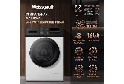 Машина стиральная фронтальная WEISSGAUFF Стиральная машина WM 47814 Inverter Steam класс: A+++ загр.фронтальная макс.:8кг белый