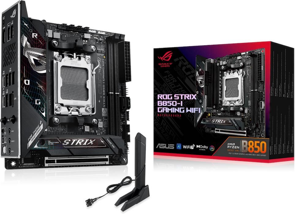 [Материнская плата] ASUS ROG STRIX B850-I GAMING WIFI (Socket AM5, mITX, 2xDDR5(128GB), HDMI/USB 10Gbps, 1xPCIe 5.0x16/1xLAN (2.5GbE), Wi-Fi 7, 2xSATA 6Gb/s, 2xM.2, 2xType-C, 4xUSB 3.2, 2xUSB 2.0)
