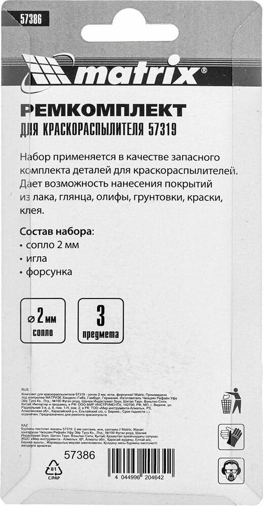 MATRIX Комплект для краскораспылителя 57319 : сопло 2 мм, игла, форсунка 57386