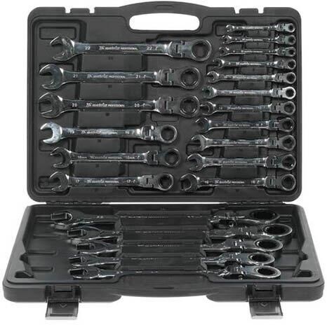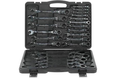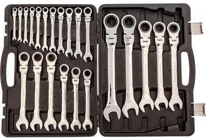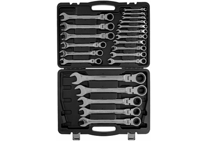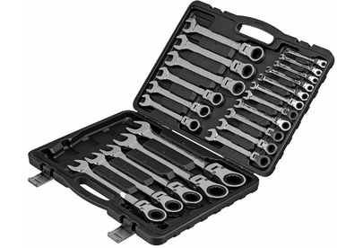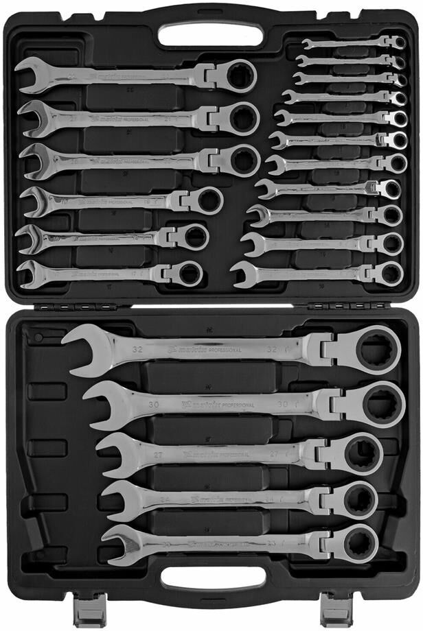 Материал: хромованадиевая высоколегированная сталь. Покрытие: хром/никель. Профессиональный инструмент: да. Тип: Набор ключей. Габариты упаковки (ед) ДхШхВ: 0.503x0.36x0.065. Вес упаковки (ед): 1.2. Трещоточный: да. Страна производства: Китай. Количество предметов: 22 предмета. Комбинированные ключи, список: 6, 7, 8, 9, 10, 11, 12, 13, 14, 15, 16, 17, 18, 19, 20, 21, 22, 23, 24, 27, 30, 32 мм. Максимальный размер ключа: 32. Минимальный размер ключа: 6. Форма ключа : прямой, шарнирный. Система измерения: метрическая. Особенности ключа: с шарнирным механизмом. Тип ключа: комбинированный. Форма ключа: прямой, шарнирный. Покрытие: хром/никель. Особенности: профессиональный инструмент, трещоточный, с шарнирным механизмом. Количество предметов: 22 предмета. Тип ключа: комбинированный. Размер ключа: мин. - 6 мм, макс. - 32 мм