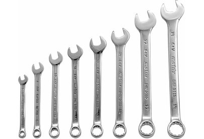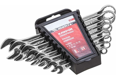 Набор Matrix 15422 включает 8 комбинированных ключей из стали CrV, размером 6-19 мм, с покрытием «полированный хром», которые пригодятся во время ремонтных работ дома или в гараже. С их помощью можно быстро монтировать и демонтировать крепежные элементы. В набор входят инструменты основных типоразмеров, позволяющие эффективно решать поставленные задачи.ПреимуществаВысокая деформационная стойкость — ключи изготовлены из хромованадиевой стали, а рабочие части закалены до твердости 45 HRC.Защита от разрушения — полированное хромоникелевое покрытие предотвращает образование коррозии.Аккуратная работа — накидные части с 12-гранным профилем охватывают всю поверхность крепежа, уменьшая риск деформации его граней.Комфортная работа в ограниченном пространстве — угол наклона кольцевых зевов относительно плоскости инструментов составляет 15°, что делает монтаж крепежа более удобным.Удобный пластиковый держатель — ключи не потеряются во время хранения и транспортировки.