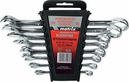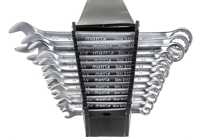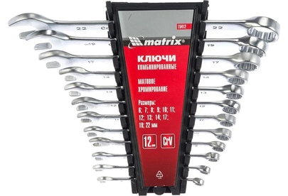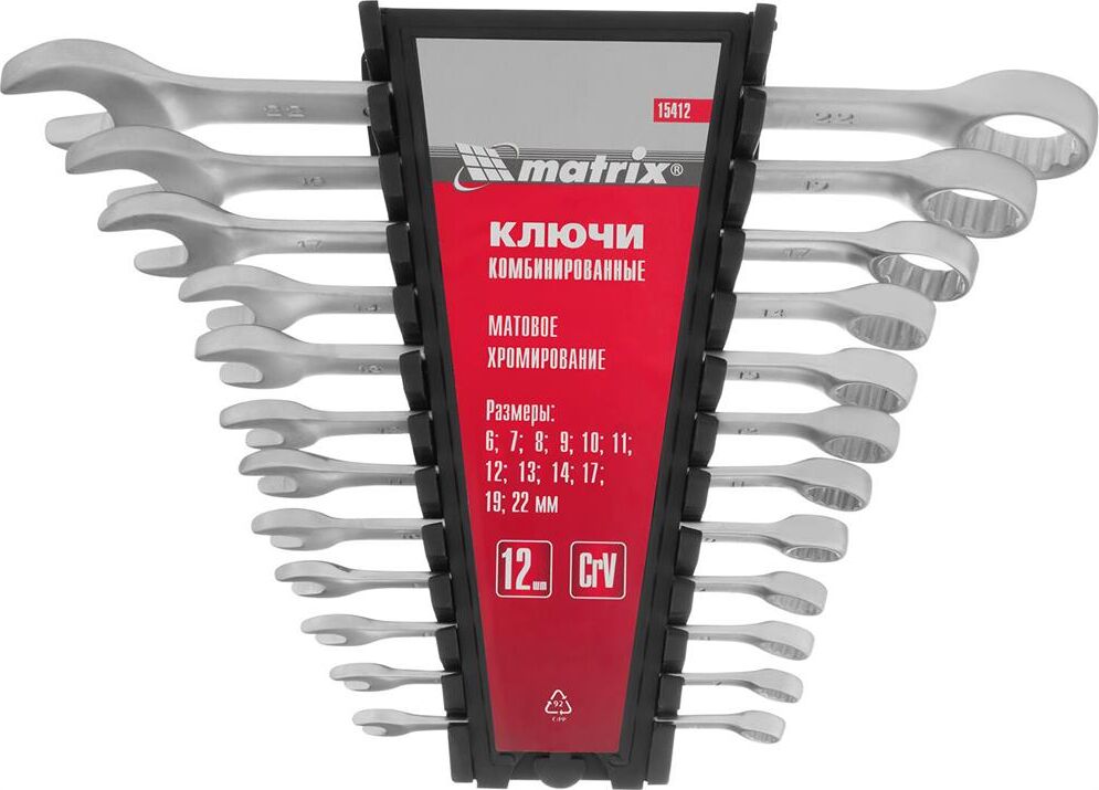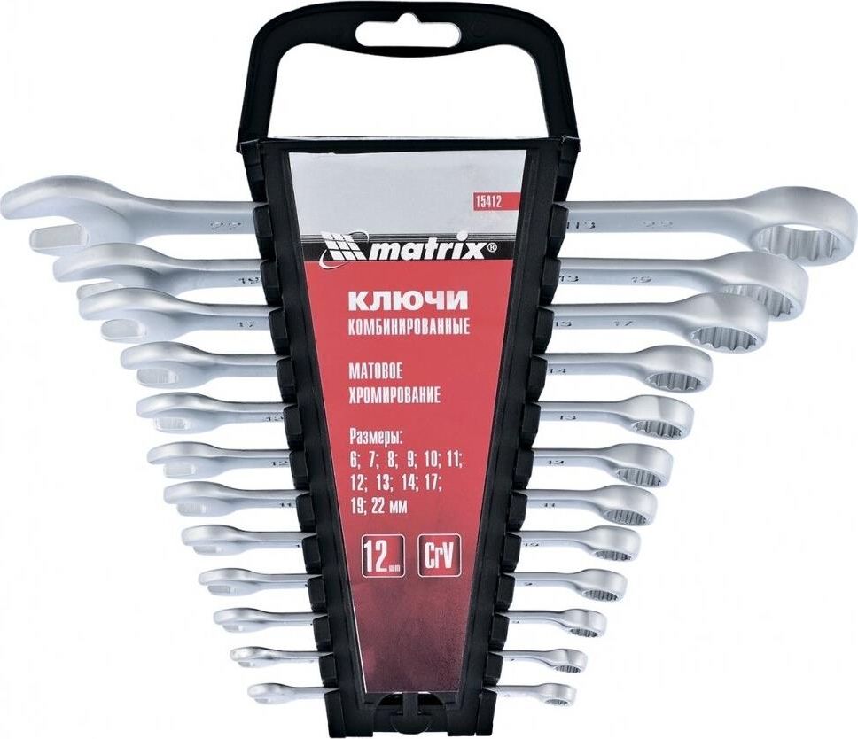 Набор Matrix 15412 включает 12 комбинированных ключей из стали CrV, размером 6-22 мм, с покрытием «матовый хром», которые пригодятся во время ремонтных работ дома или в гараже. С их помощью можно быстро монтировать и демонтировать крепежные элементы. В набор входят инструменты основных типоразмеров, позволяющие эффективно решать поставленные задачи.ПреимуществаВысокая деформационная стойкость — ключи изготовлены из хромованадиевой стали, а рабочие части закалены до твердости 45 HRC.Защита от разрушения — матовое хромоникелевое покрытие предотвращает образование коррозии.Аккуратная работа — накидные части с 12-гранным профилем охватывают всю поверхность крепежа, уменьшая риск деформации его граней.Комфортная работа в ограниченном пространстве — угол наклона кольцевых зевов относительно плоскости инструментов составляет 15°, что делает монтаж крепежа более удобным.Удобный пластиковый держатель — ключи не потеряются во время хранения и транспортировки.