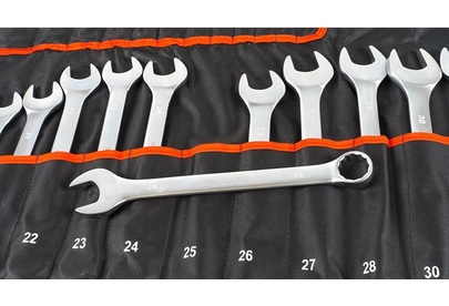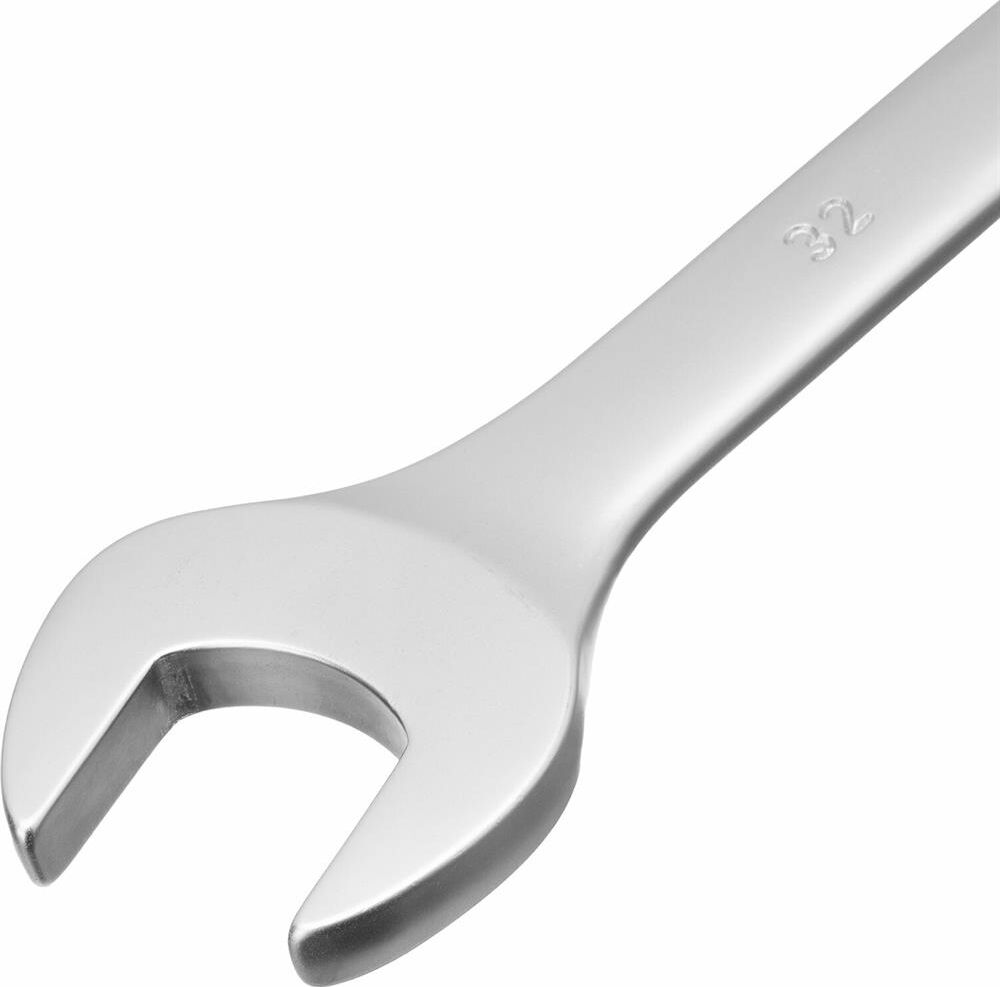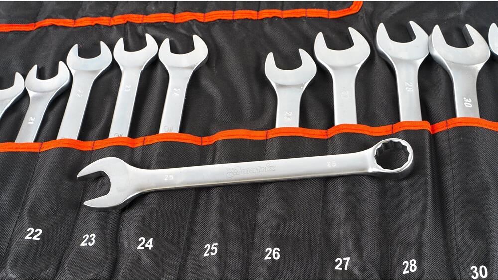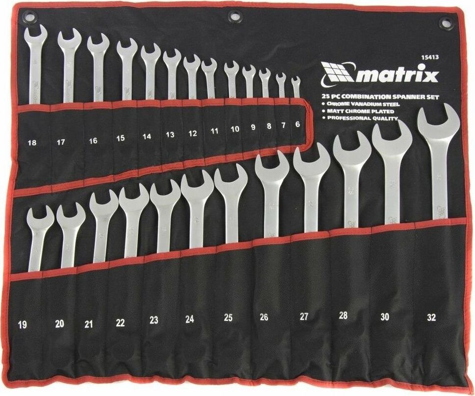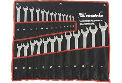 Набор Matrix 15413 включает 25 комбинированных ключей из стали CrV, размером 6-32 мм, с покрытием «матовый хром», которые пригодятся во время ремонтных работ дома или в гараже. С их помощью можно быстро монтировать и демонтировать крепежные элементы. В набор входят инструменты основных типоразмеров, позволяющие эффективно решать поставленные задачи.ПреимуществаВысокая деформационная стойкость — ключи изготовлены из хромованадиевой стали, а рабочие части закалены до твердости 48 HRC.Защита от разрушения — матовое хромоникелевое покрытие предотвращает образование коррозии.Аккуратная работа — накидные части с 12-гранным профилем охватывают всю поверхность крепежа, уменьшая риск деформации его граней.Комфортная работа в ограниченном пространстве — угол наклона кольцевых зевов относительно плоскости инструментов составляет 15°, что делает монтаж крепежа более удобным.Удобный чехол — ключи, размещенные в индивидуальных карманах, не потеряются во время хранения и транспортировки.