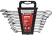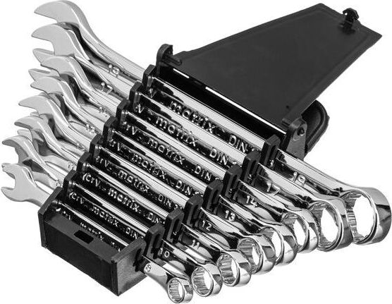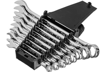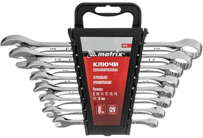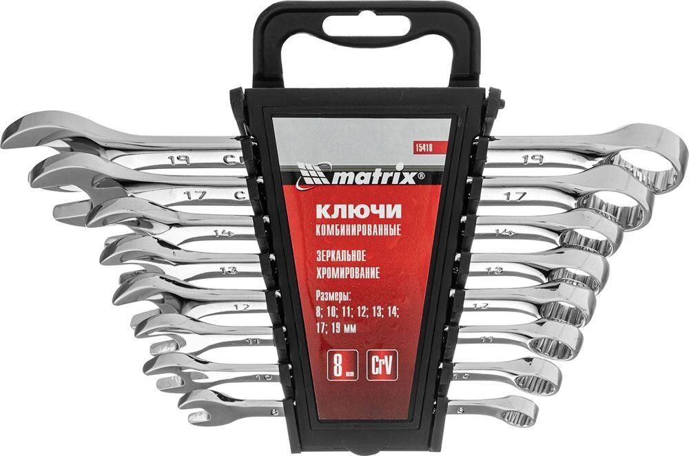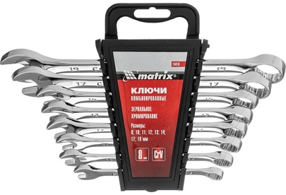Набор Matrix 15418 включает 8 комбинированных ключей из стали CrV, размером 8-19 мм, с покрытием «полированный хром», которые пригодятся во время ремонтных работ дома или в гараже. С их помощью можно быстро монтировать и демонтировать крепежные элементы. В набор входят инструменты основных типоразмеров, позволяющие эффективно решать поставленные задачи.ПреимуществаВысокая деформационная стойкость — ключи изготовлены из хромованадиевой стали, а рабочие части закалены до твердости 45 HRC.Защита от разрушения — полированное хромоникелевое покрытие предотвращает образование коррозии.Аккуратная работа — накидные части с 12-гранным профилем охватывают всю поверхность крепежа, уменьшая риск деформации его граней.Комфортная работа в ограниченном пространстве — угол наклона кольцевых зевов относительно плоскости инструментов составляет 15°, что делает монтаж крепежа более удобным.Удобный пластиковый держатель — ключи не потеряются во время хранения и транспортировки.