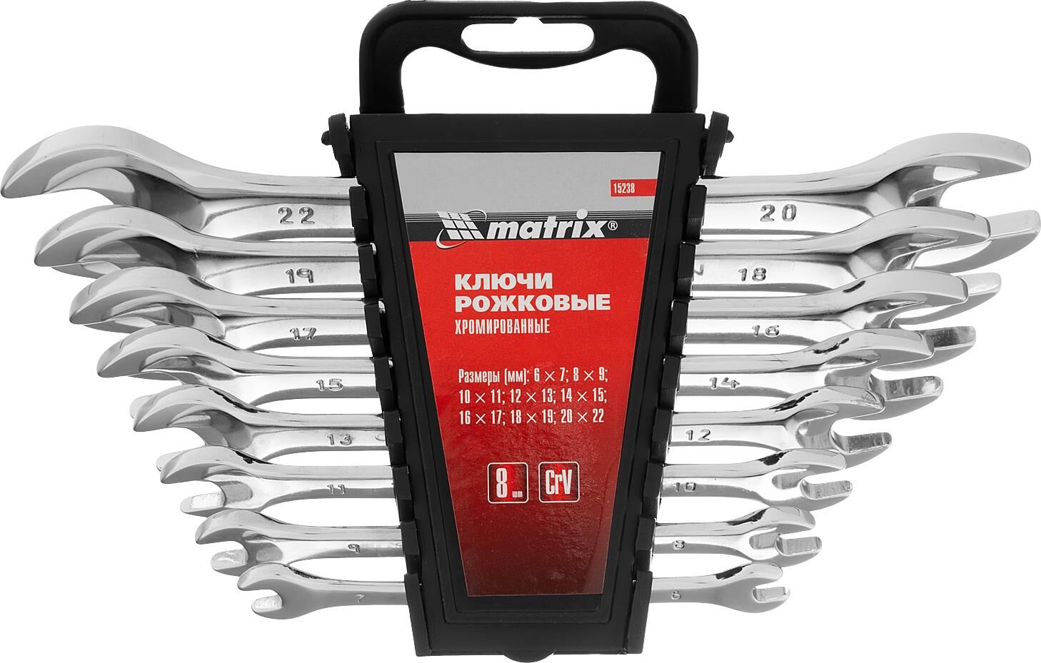 MATRIX Набор ключей рожковых 8 шт, 6-22мм, CrV, Elliptical, зеркальное хромирование 15238