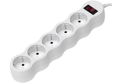 Сетевой фильтр с общим выключателем. Макс. мощность 2300Вт, 10А, 5 евророзеток с заземлением, защитные шторки, длина кабеля 3 метра. Цвет белый.