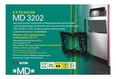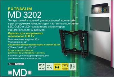 Для LCD до 42 ". Ультратонкий стальной кронштейн с наклоном, Нагрузка до 35 кг.Угол наклона: 10*, VESA от 75х75 до 200х200 мм, Расстояние от стены 25 мм, Встроенный уровень.