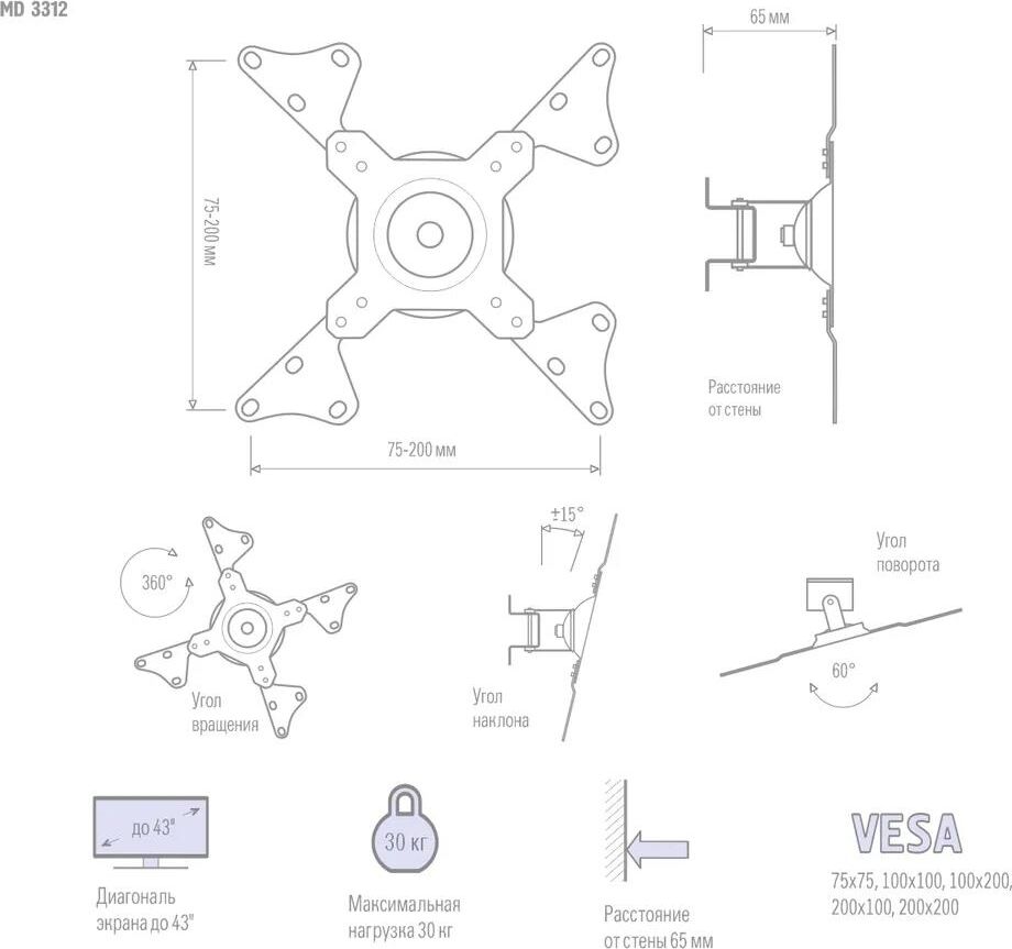 Тип кронштейна Наклонно-поворотный. Крепежные отверстия (VESA) 75x75, 100x100, 100x200, 200x100, 200x200. Мин. диагональ экрана (дюймы) 15. Макс. Диагональ экрана (дюймы) 45. Максимальная нагрузка, (кг.) 30. Угол наклона (°) 15. Угол повотора (°) 60. Вращение экрана (°) 360. Расстояние от стены (мм.) 65. Цвет кронштейна белый. Гарантия (лет) 2.