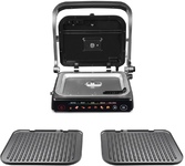 Гриль CASO SteakChef используется в частных домах и квартирах для жарки мяса, рыбы и овощей. Модель оснащена ручкой, поворотными регуляторами, светодиодным дисплеем и подвижным шарниром для равномерной прожарки продуктов разной толщины. Съемные пластины с антипригарным покрытием без PFAS можно мыть в посудомоечной машине. Корпус выполнен из анодированного алюминия, крышка - из стекла. В комплект поставки входит съемный лоток для сбора жира. Особенности: 2-в-1: контактный гриль и настольный гриль в одном корпусе Встроенные в пластину нагревательные элементы Быстрый нагрев Большая площадь приготовления Индикатор питания и нагрева Полное раскрытие крышки Керамическое покрытие Характеристики: Структура нижней поверхности: рифленая Структура верхней поверхности: рифленая Напряжение: 220 В Угол наклона: 4 ° Время таймера: до 30 мин. Диапазон температуры: от 100 до 220 °С Угол раскрытия: 180 ° Частота: от 50 до 60 Гц Цвет: черный, серый Мощность: 2 кВт Ширина: 385 мм Глубина: 375 мм Высота: 180 мм Вес: 6.2 кг