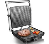 1800 Вт, жаропрочное антипригарное покрытие, регулируемый термостат (160-240°C), открытие панелей на 180°, съемные панели 290*230 мм, световой индикатор работы/нагрева, контейнер для сбора масла, защита от перегрева, горизонтальное хранение и транспортиро