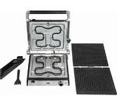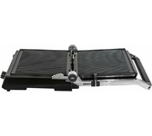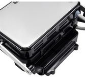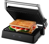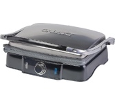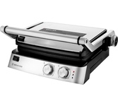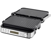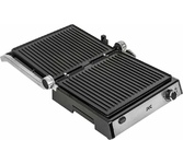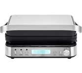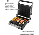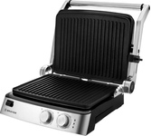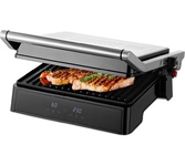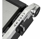 Гриль электрический, мощность 2000 Вт, корпус из матовой нержавеющей стали, плавающая крышка для регулировки толщины с 5 различными настройками высоты, съемные антипригарные панели, встроенный поддон для жира, регулятор температуры с индикатором, скребок в комплекте, панели можно мыть в посудомоечной машине