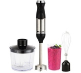 800 Вт, мощный и тихий DC мотор, 2 скорости работы, лезвия из нерж.стали, погруж.часть блендера из нерж.стали, насадка-венчик из стали, градуированный стакан (0,7 л), чоппер (0,5 л) с острыми ножами из нерж.стали