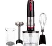 мощный и тихий DC мотор, 2 скорости работы — дополнительная регулировка, острые лезвия из нержавеющей стали, погружная часть блендера из нержавеющей стали, венчик из нержавеющей стали; 3 насадки (блендер, венчик, чоппер 0,5 л), стакан (0,5 л)