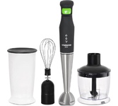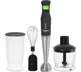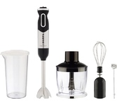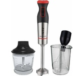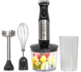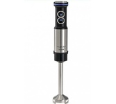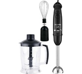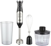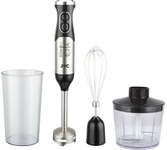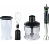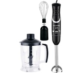Блендер погружной, набор, максимальная мощность 1000 ватт, 2 скорости включая режим ТУРБО, бесступенчая регулировка скорости - до 6 скоростых режимов, погружная часть блендера из нержавеющей стали, измельчитель 500 мл, мерный стакан 700 мл, венчик для взбивания, цвет корпуса черный с металлической вставкой