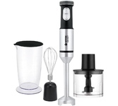 Погружной блендер, мощность 750W, современный эргономичный дизайн, пульсовый режим работы, 2 скорости, лезвия из нержавеющей стали, металлическая нога блендера, венчик для взбивания, насадка для приготовления пюре, чаша с ножом для рубки и измельчения, 400 мл; автоматическая блокировка при неправильно установленной насадке, удобство и простота в обращении и чистке.