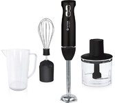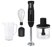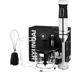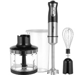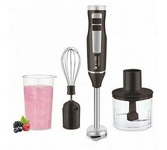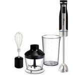 Мощность 1500 Вт Лезвия из титана Погружная часть из нержавеющей стали Корпус из пластика, декорирован нержавеющей сталью Плавная регулировка скорости Турборежим Скорость вращения: 14000 об/мин ± 10% Насадка-венчик для взбивания Стакан для смешивания 600 мл Удлиненная насадка-блендер для измельчения и смешивания Насадка-измельчитель объёмом 500 мл Длина шнура 1 м Электропитание 220-240 В, 50-60 Гц