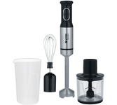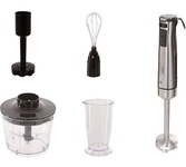 Мощность 1200 Вт Погружная часть и лезвия из нержавеющей стали Корпус из пластика, декорирован нержавеющей сталью Плавная регулировка скорости Насадка-венчик для взбивания Стакан для смешивания 700 мл Насадка-блендер для измельченияи смешивания Насадка для приготовления пюре Капучинатор Насадка-измельчитель объемом 500 мл Электропитание 220-240 В, ~ 50-60 Гц