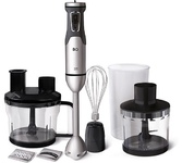 Корпус из нержавеющей стали и пластика Управление механическое Плавная регулировка скорости Длина шнура 1 м Объем мерного стакана 600 мл Объем чаши измельчителя 500 мл Тип ножей нержавеющая сталь Мощность 1400Вт Комплектация: Прибор Венчик для взбивания Переходник венчика Измельчитель с крышкой Мерный стакан с крышкой Инструкция